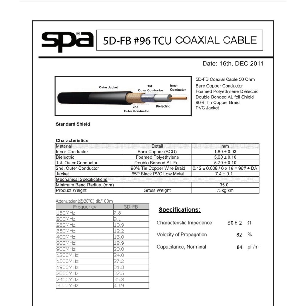 RG–8A/U ยี่ห้อ SPA 8D–FB ที่ความยาว 20 เมตร แตกต่างกัน 2.34 W